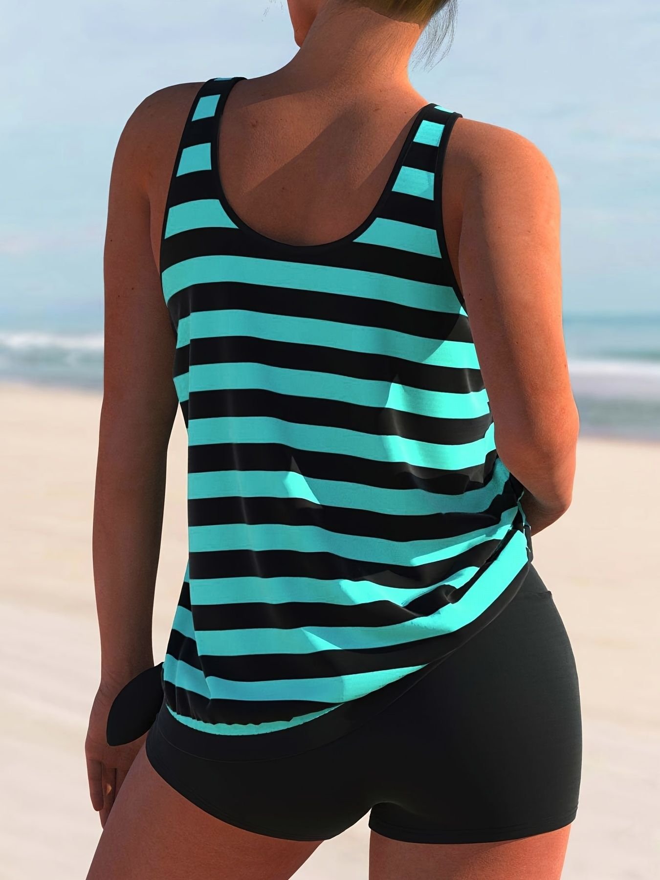 Plus Size Casual Tankini Set, Women's Plus Ribbed Stripe Print High Stretch Tank Top & Shorts Tankini Two Piece Set